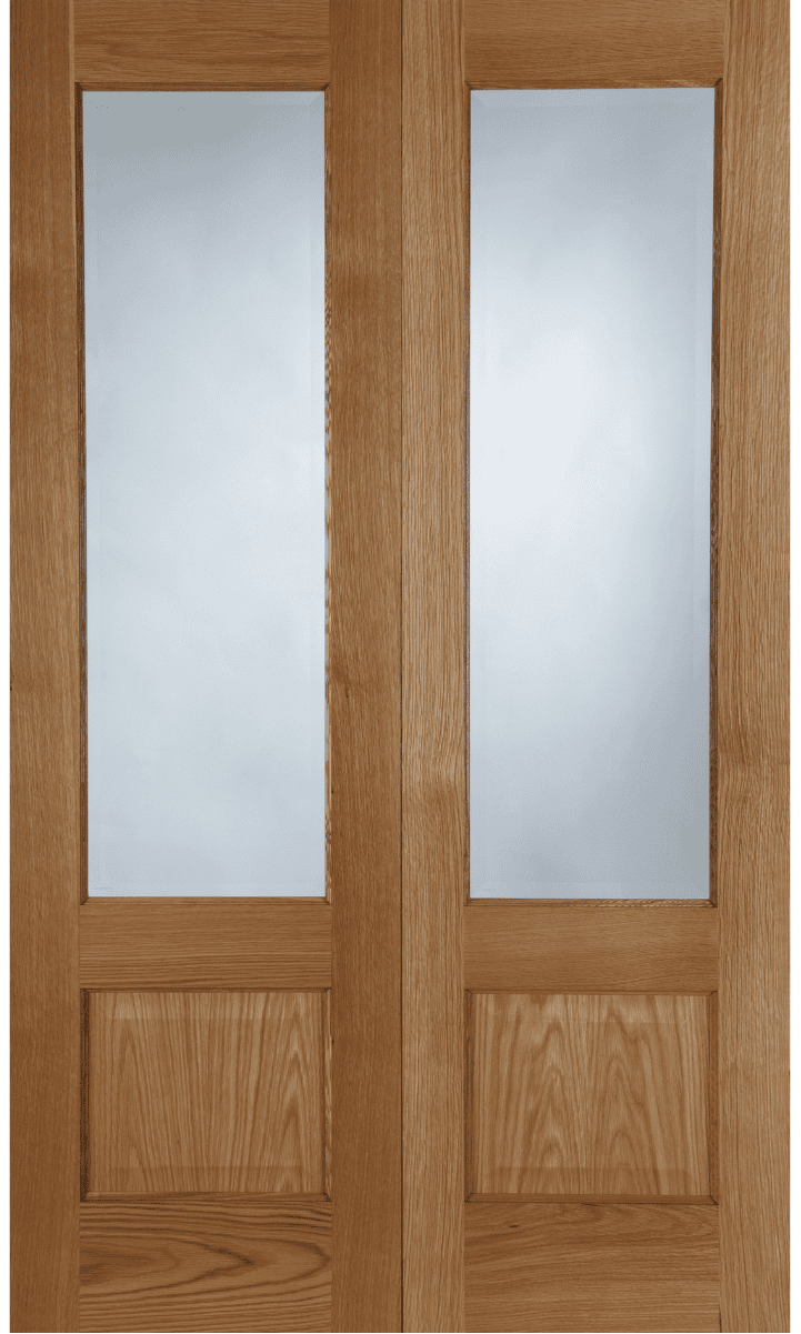 The Oak Chiswick Pair offers a traditional look with its clear glazed panel design and decorative bead detailing — perfect for wider openings that need a matching pair of oak doors.