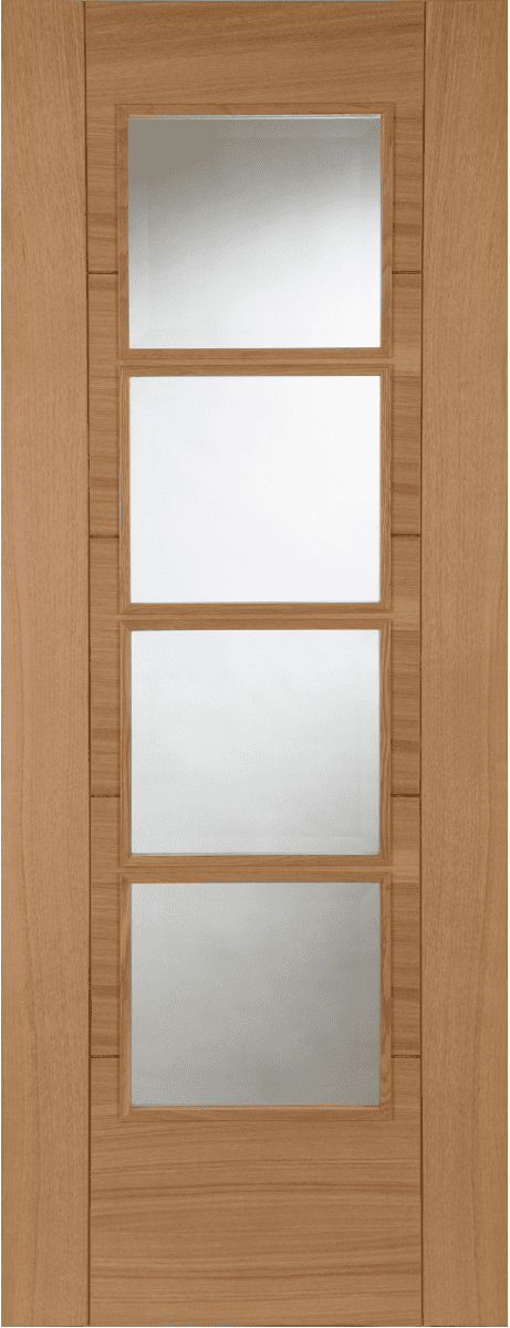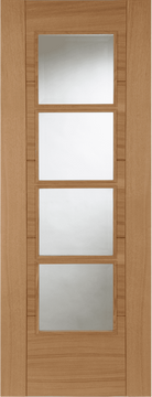 Featuring four central glazed panels framed by quarter-cut oak veneer and solid ‘V’ grooves, it blends warmth, strength, and modern elegance. The closed-pore finish highlights the oak grain beautifully, making it a standout choice for both contemporary and traditional interiors.