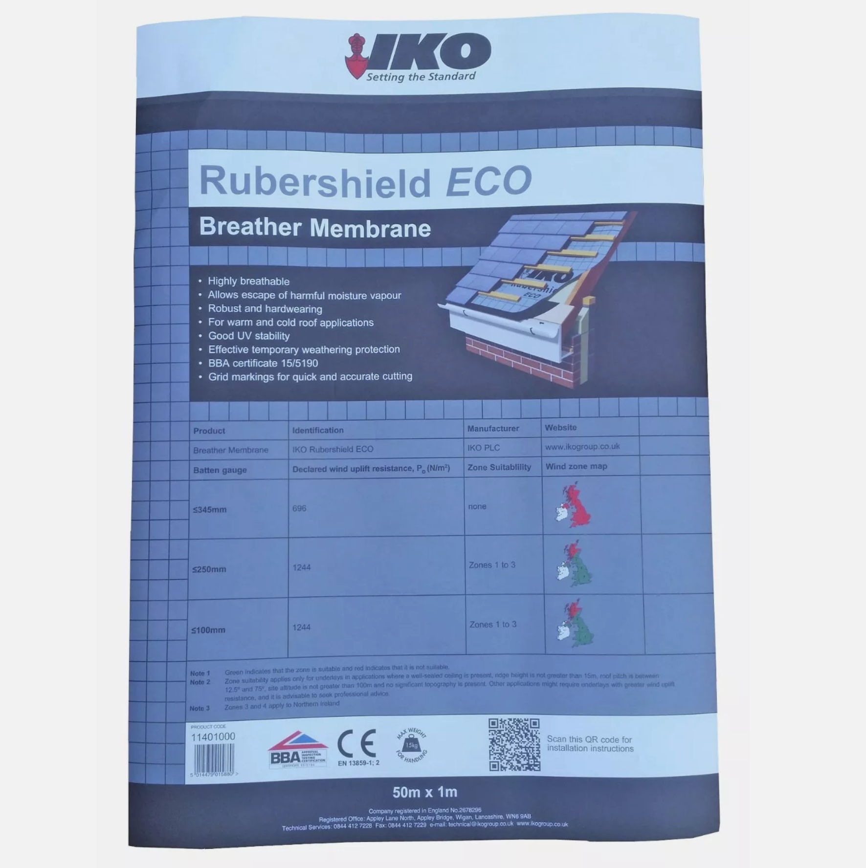 IKO Rubershield Eco is a 100 g/m² Type LR breather membrane designed to keep pitched roofs dry and well ventilated.